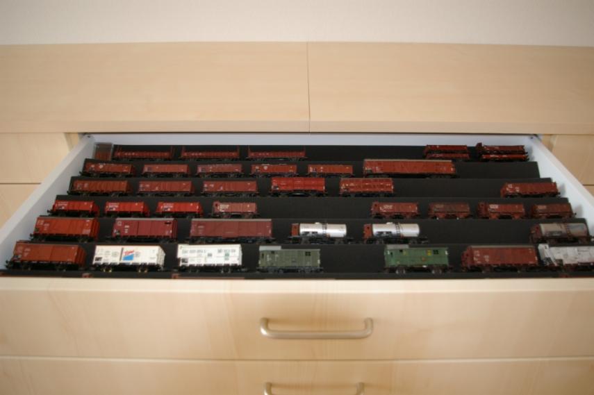 Gute Zugriffsmöglichkeit um die Fahrzeuge aus den Aufnahmen zu entnehmen. Die Schubladeneinleger werden individuell nach Kundenwunsch auf Maß gefertigt. Preise richten sich nach Stückzahl und Ausführung, Lieferzeiten 3-4 Wochen.